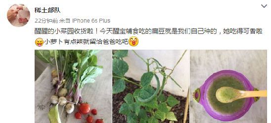 8月23日,章子怡晒出一组自己收获的亲手种的菜的照片,发文:“醒醒的小菜园收货啦!今天醒宝辅食吃的扁豆就是我们自己种的,她吃得可香啦,小萝卜有点辣就留给爸爸吃吧。”
