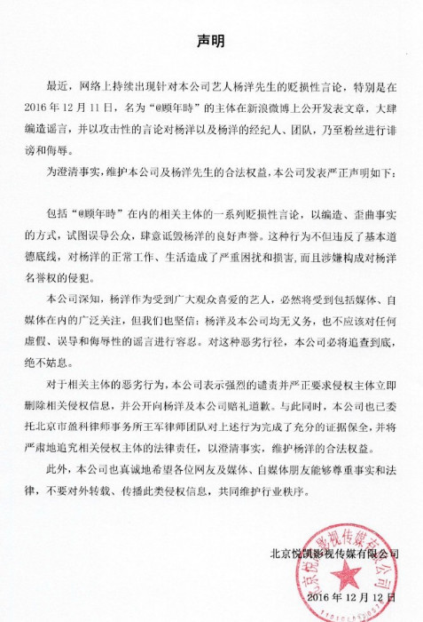 杨洋公司发声明