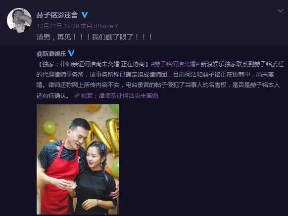 随后有媒体联系到赫子铭委任的代理律师事务所,该事务所称已确定组成律师团,目前何洁和赫子铭正在协商中,尚未离婚。